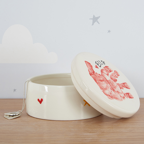 Our beautiful round box personalised with your child’s hand or foot print. Choose from our lovely bright colours, and then we’ll finish everything off in our Popolo style. The box not only makes a great keepsake, but a brilliant place to keep jewellery and watches. As standard, we add a small heart next to the print and your child’s name. Once we have captured the print, you will receive a copy of your order. We will then glaze and fire your order and it will be completed 2 weeks later (lead-times can be 3 weeks at busy times)